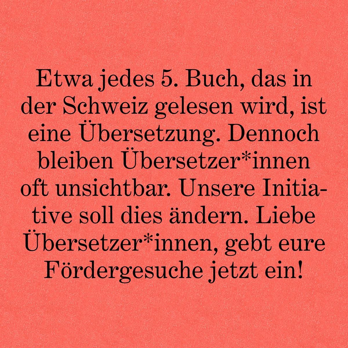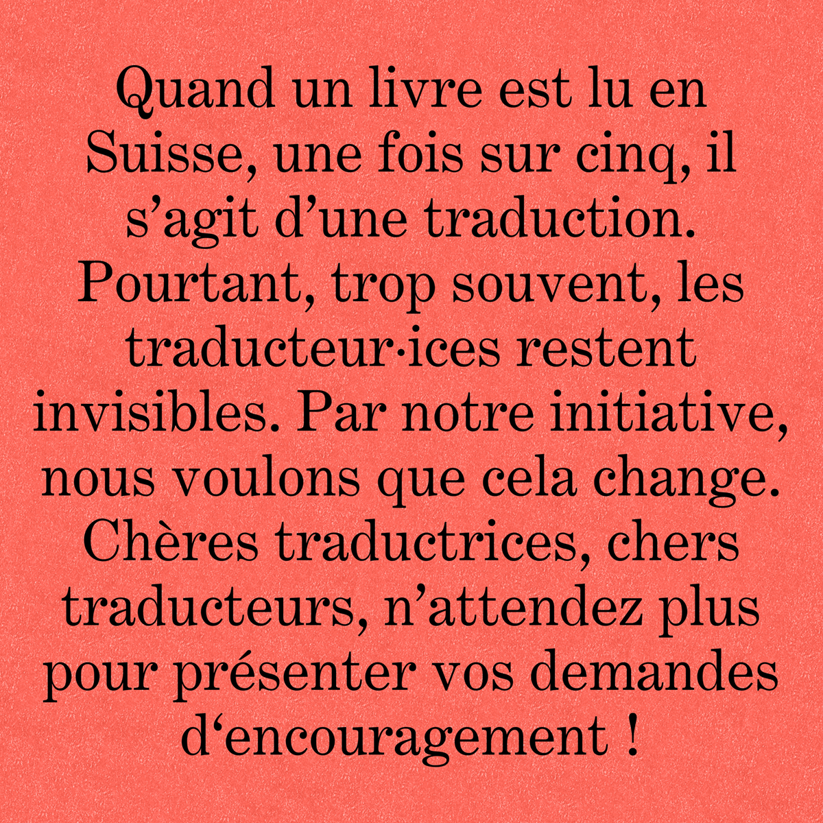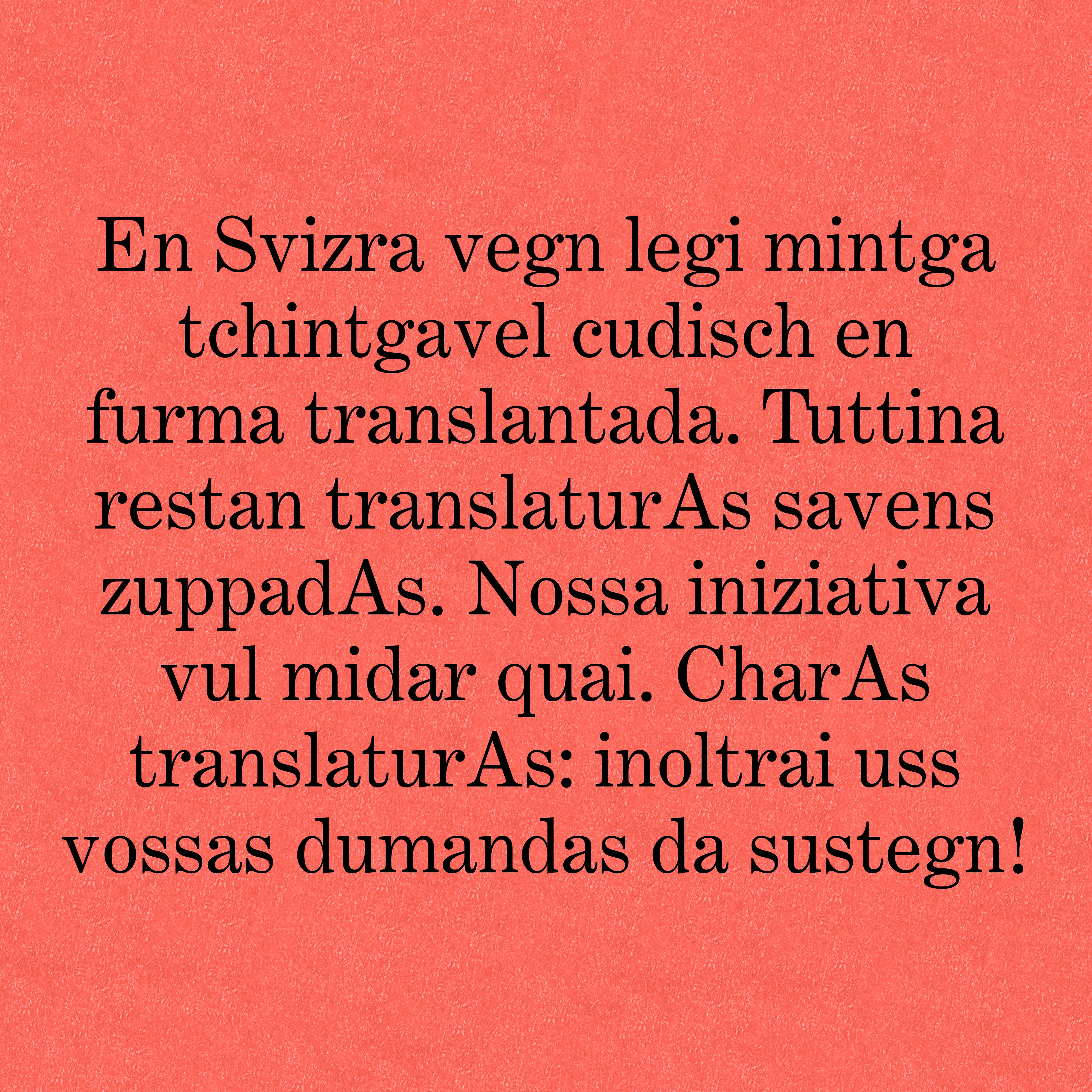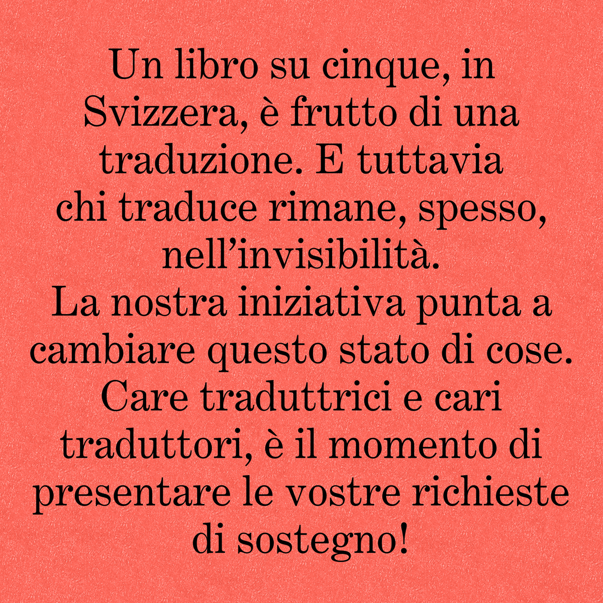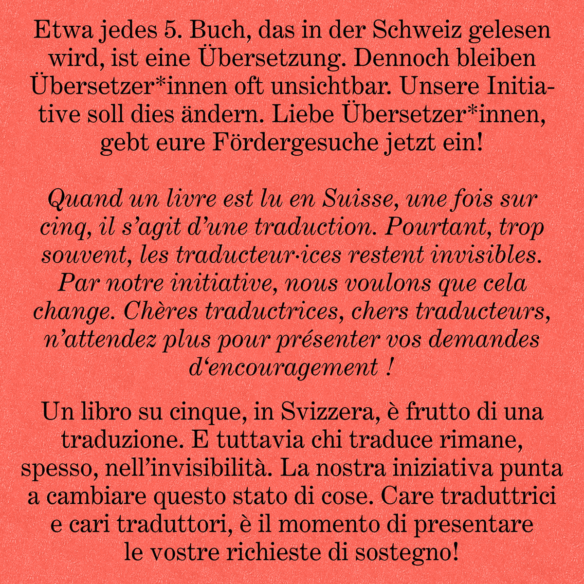 Se esiste un panorama letterario vivo, se ponti tengono unite tra loro le varie aree linguistiche, se la diversità trova spazio sugli scaffali delle nostre librerie, lo dobbiamo ai traduttori e alle traduttrici. Eppure il loro lavoro spesso non riceve alcun incentivo, è mal pagato e invisibile. Con la campagna «Niente Svizzera senza traduzione» vogliamo cambiare questo stato di cose. E vogliamo farlo insieme a voi.